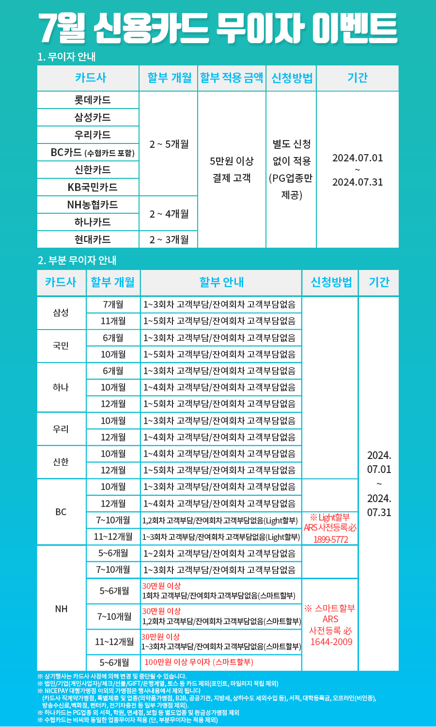 [공지] 2024년 7월 신용카드 무이자 및 부분 무이자 할부 안내