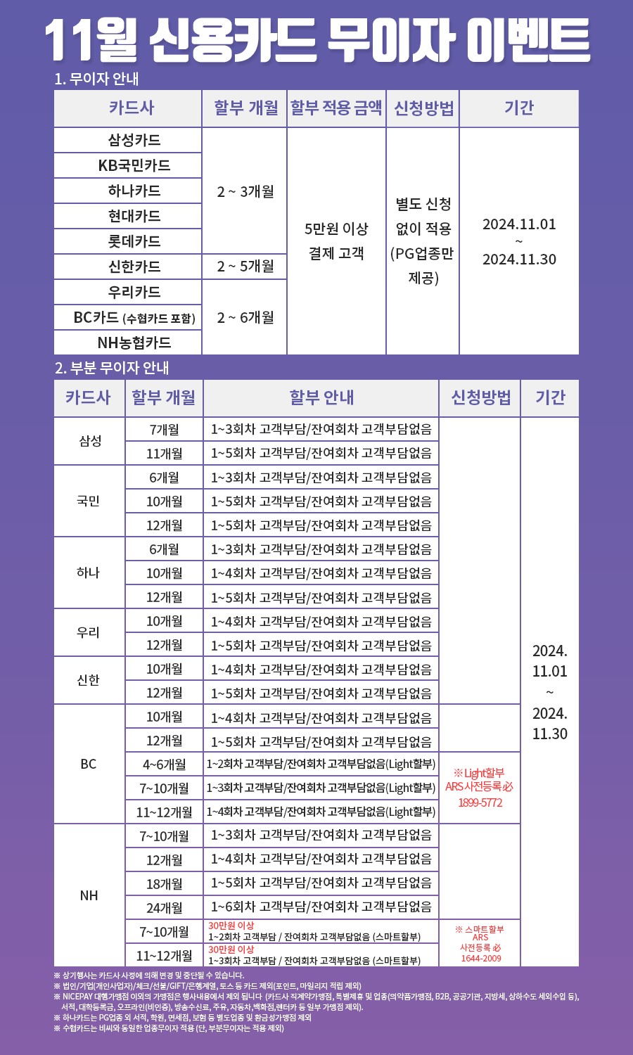 [공지] 2024년 11월 신용카드 무이자 및 부분 무이자 할부 안내
