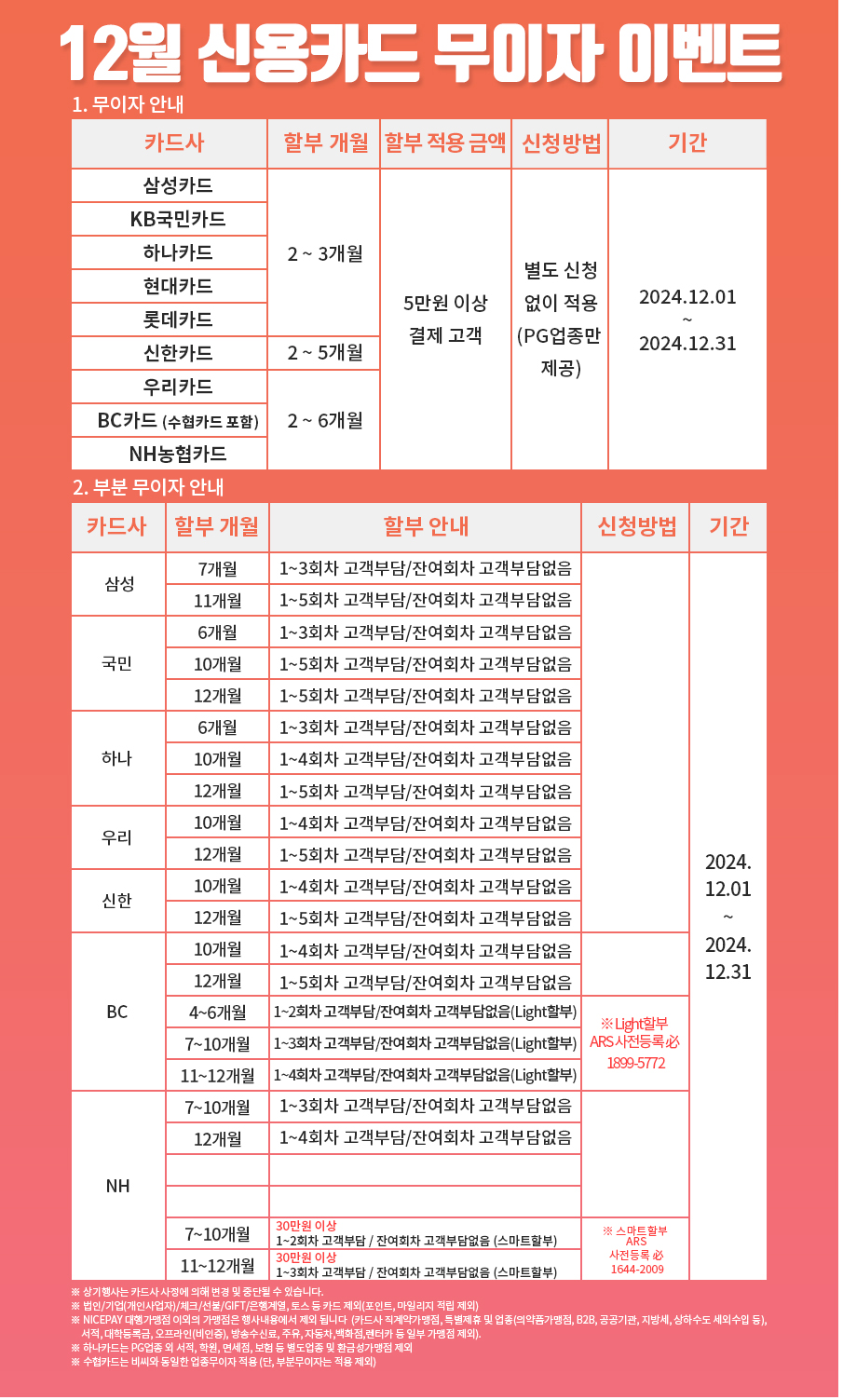 [공지] 2024년 12월 신용카드 무이자 및 부분 무이자 할부 안내